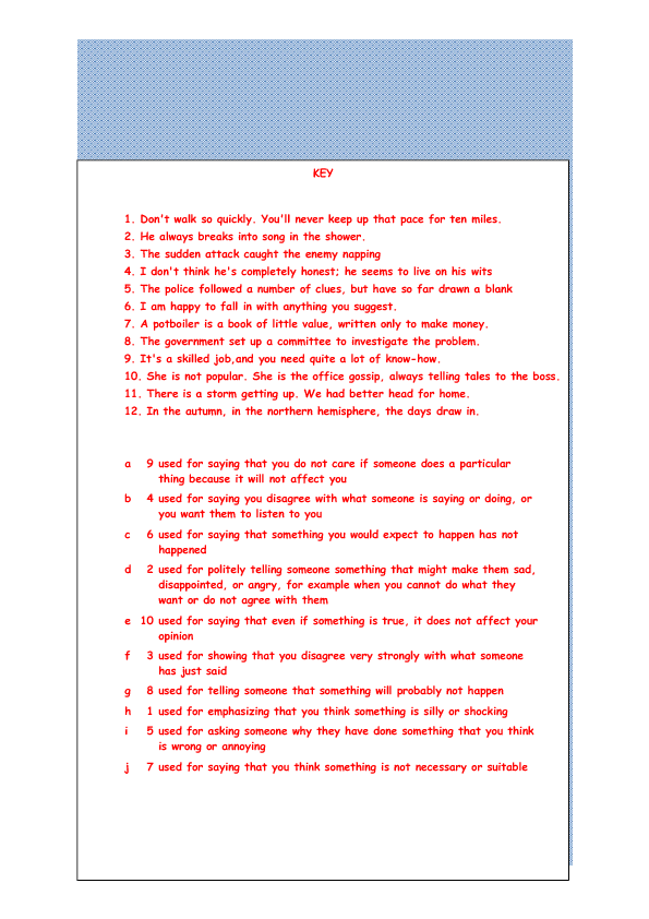 This worksheet is for more advanced students and is in two parts. In the first part students have to complete the sentences using one of the words given and in the second part find the correct definitions for the fixed expressions. Complete with key.