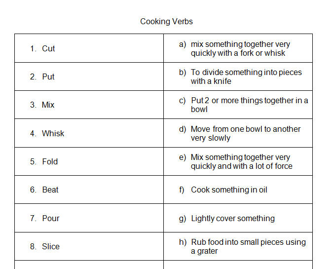 Matching vocabulary of cooking verbs and their definitions. Then instructions on how to make a microwave cake that students have to put in right order. Worked really well with a group of Saudi housewives as we actually made the cake. Then got students to write their own recipes after.