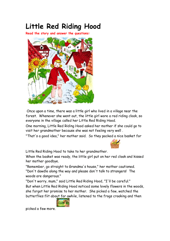 It is the story of the Little Red Riding Hood with comprehension questions so that we can ensure that students have understood it. Students will have to draw pictures from the story to have fun, and retell the story. They will also have a writing task to write the story in a different way in order to encourage them to be creative and use the language they know.